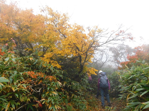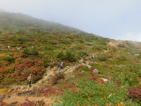 | 曇りの空模様の中で宿を出発したが、あだたら高原スキー場に到着すると、雲が晴れてゆき、紅葉した山の景色を楽しみながら山頂に着く。しかし、山頂に着く手前からガスが上がってきて、山頂ではガスに囲まれ眺望を望むことができなかった。 山頂で昼食をとり、再びガスの上がった道を紅葉を楽しみながら、峰の辻から建替え解体中のくろがね小屋を経て砂利道の林道を通り、山麓駅に戻った。 |