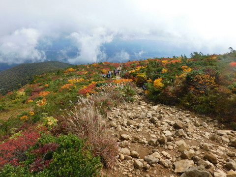 | 曇空の下、登山スタート。暫くは鬱蒼とした緑の中を歩く。温泉跡では硫黄の臭い、足元では竜胆が咲く。上がるに連れて紅葉、黄葉が増えていった。あいにく頂上の視界はなく猪苗代湖を眺める事も出来なかった。 | |
