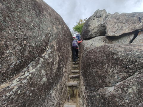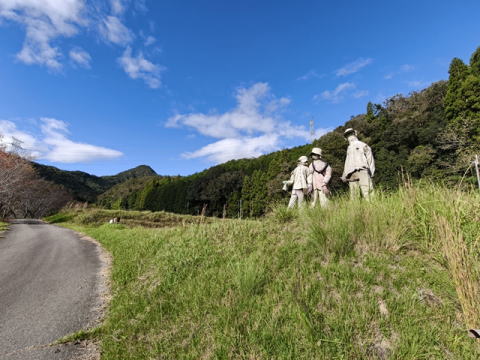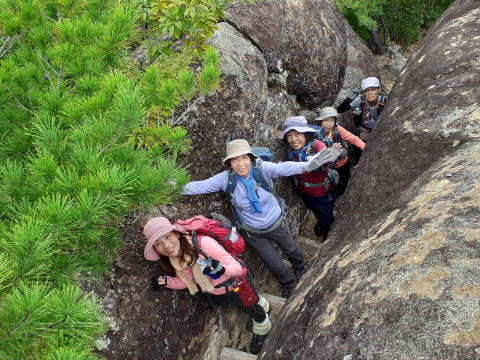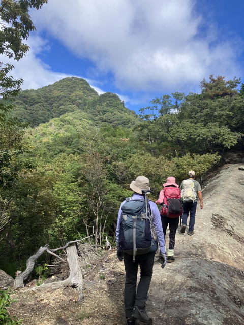 | 案山子の立っているのどかな登山口から、播磨富士・明神山のCコースを登る。途中夢眠(ムーミン)岩から合掌岩、がまん坂の急登を登り地蔵岳に着く。地蔵岳からは聳え立つ山頂が見え、そこから少し下って八丁坂を登ると山頂である。瀬戸内海まで見渡せる絶景だった。下りはAコース。西の丸からマンモスの背、大国岩と、登りも下りも面白い岩場の連続の山であった。 |