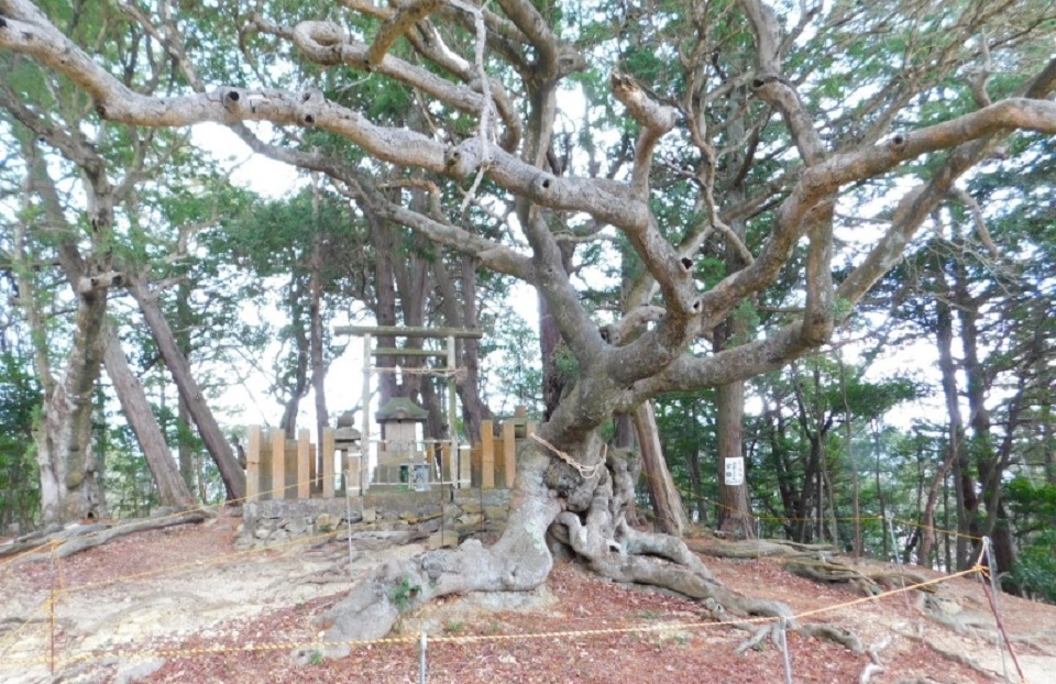 ![]() 山頂の雨山神社とヤマモモの木の前で |