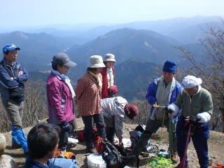 この日も前回の三峰山同様、お天気に恵まれ、とても暖かい日でした。3日ほど前とても寒い日があったので、雪があるかと思いましたが、山頂付近にわずかに残る程度でした。山頂付近は、広葉樹林が広がり、冬の樹氷以外も、新緑、黄葉,紅葉がきっときれいでしょう。ぜひ冬以外ももう一度訪れたいです。山頂では会員の方のシュリンゲやコンパスの使い方の講習、そして豚汁のふるまいととても有意義な山行きでした。 |
