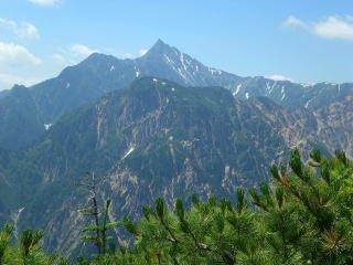 ![]() 三ツ岳に至る稜線にて、槍を望む |