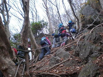 | 今回の山行は、紅葉も終わり落葉した自然林で覆われた低山(953m)でしたが、思いの他変化 に富んだ 急斜面と急な岩場を伝い、スリルを満喫できて達成感も味わえた山行でした。 (記:H・H) |