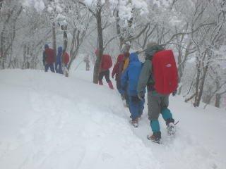| 明寺P場はすでに満杯状態、あざみ小屋の廻りは雪に覆われている、行者コバにて昼食するが、細かい雪が降っており、風もあって慌ただしい食時であった、これより急登、樹氷の中を登る、風が強くなってきた、雪の量はかなり多い。 団体さんが続々降りてきだした、山頂は銀世界だが、展望はきかず、早々に下山、雪のおかげで足取りも軽く、楽くに下山できた。 |