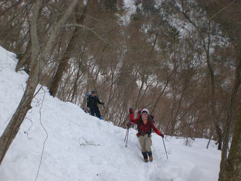 来た道を下山、あまりの急坂に一瞬たじろぐ?新雪を下った方が下り易い、途中雪質が変わり降り方変えて全員無事下山