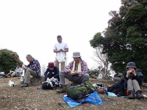 | もう中止かと開いたメールに明日行きますとのこと、気持ちを切り替えて山行にのぞみました。ナンジャモンジャ広場って ただの駐車場ジャン。登山口まで約40分。とってもとっても素直ないい道、他に登山者は見当たらず私たちだけ、多分 25000分の1の地図には載ってない道であろう頂上近くの岩がごろごろしたとこもちょっと変化があって、頂上も見晴らし よく、雨にも会わず今日は私には100点の山行でした。 |