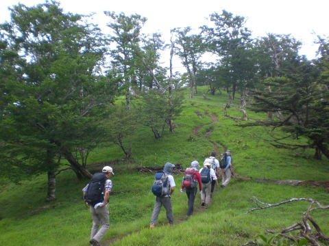 | 分岐まではややキツイ登りであったが、その後千丈平まではバイケイソウと小笹の茂るゆるやかな道を右手に大日岳の岩峰を見ながら 歩いた。 古田の森あたりからはガスが出始めて、終日展望が無くなり、大峰奥駆道の山々が見えず残念だった、釈迦岳での昼食後、 本日のメイン孔雀岳へ気を引き締めて出発した。最初に急下りがあり、その後も岩あり崖あり鎖ありロープありの道を三点確保で緊張 しながら、1時間超で孔雀岳へ到着した、雨も予想されたので、急ぎ往路を下山した。岩場通過の経験や普段より早い歩きなどで、夏山 山行の訓練にはなったと思います。 記M/T |