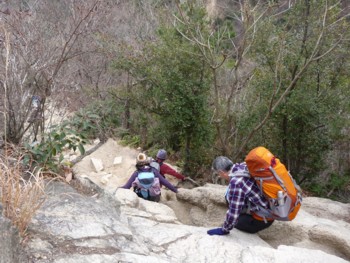 雪も少なく、ところどころ凍っていましたがアイゼンの装着なしで七曲滝、百間滝まで行く事 ができ迫力ある滝をみることが出来ました。 極楽茶屋までの途中、少しの間アイゼン装着での歩行でした。一軒茶屋からの下りが本当に 長く最終のロックガーデンは足の疲れもあるので注意しながら下山しました。 歩行時間が長く大変でしたが、厳しい寒さが一段落し青空が広がり最高の山行日よりとなり 充実した一日でした。 〔記:N・H〕