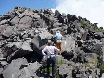 | 雪渓が諸処に残ってはいるが日陰がなく暑かった。登りの外輪山コース、時々吹く風が 心地よかった。下りの谷コースは雪渓があるにもかかわらず、風がなく蒸し風呂のよう だった。花とオコジョに癒された。(C・I記) |