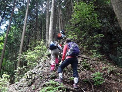 ◇雨上がりの新緑とコアジサイやガクウツギの可憐な花を眺めながら、30分ほどで琵琶の滝に到着。 前日の雨で水量を増した滝が姿を見せる。ここからの登山道は予想以上の急登が待っていた。ロープが 張られた急峻な岩場も多く、極めつけの女郎岩では、左右の足を置く足場の確保に苦労する。女郎岩を 越えた先の尾根筋は一転なだらかで、ブナ林が美しい。長年の落葉がふんわりと積み重なった山道はフ カフカの絨緞のよう。時折、林の切れ目から大峰の山々を望むことができる。百合ヶ岳山頂で昼食後、 下山開始。展望岩からは、その名の通り大峰の山々が望める。なかでも白鬚岳の尖峰が特徴的。面白そ う。いつか登りたい。下山道は単調ながら、谷筋ではアカハライモリ、石清水では渓流に棲息するナガ レタゴガエルの卵塊にも出会った。また、久々にアサギマダラの飛翔やアカタテハの吸水も見ること ができ、大満足の一日でした。 |
