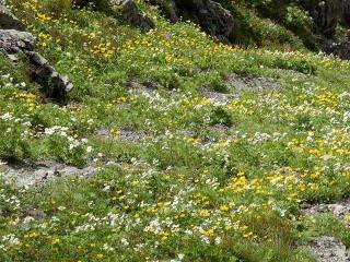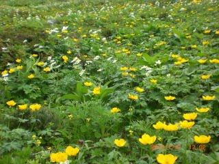 | 7月20日 南アルプス特有の深い森は、登れど登れどどこまでも続いた。大汗をかきながらシラビソの森を抜け、ようやくたどり着いた千枚小屋は新しく快適。美味しいみそ汁がくたびれた体にしみわたる。 7月21日 千枚小屋から荒川小屋まで千枚岳、丸山岳、悪沢岳、中岳、前岳の5つのピークも晴天に恵まれ360度の大パノラマの展望を楽しみ、絨毯のように見えるお花畑ではハクサンイチゲ、シナノキンバイ、ダイコンソウ、クロユリ等多種多様のお花と雷鳥家族にも出会え雄大な景色とお花を堪能し、荒川小屋を下に見てからはティータイムを取るなどノンビリ山行最高でした。