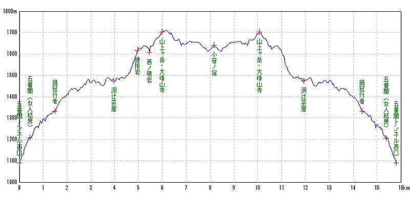 | 《コースタイム》 五番関トンネル西口P(8:00)~五番関結界門(8:15)~洞辻茶屋(9:55)~西の覗 (10:45/52)~大峰山寺(11:05)~山頂付近で昼食(11:15/40)~小笹の宿(12:23/40)~大峰山寺(13:16/30)~西の覗(13:40)~洞辻茶屋(14:08/15)~五番関結界門(15:50)~五番関トンネル西口P(16:00) | |