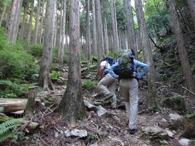 | 夏山に参加できなかった3人で、霊山・山上ヶ岳を目指しました。何故かセミ・カエルや鳥の鳴き声が殆どしない静寂な登山道、大峰山寺から響く法螺貝の音、修験者の衣装をまとった多くの登山者、すれ違う人との「ようお参り」の挨拶等々、山上ヶ岳は他の大峰山系の山とは少し違った独特の山でした。急登や岩登りもあり、久々の山行で少々疲れましたが、心洗われる1日でした。 | |