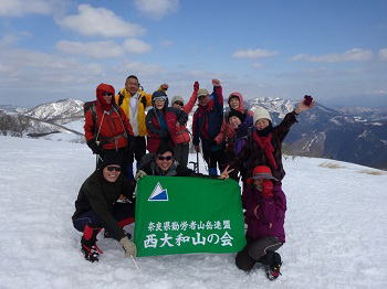 | ◇マキノ高原スキー場は雪は全くなかったが登山道に入ると固くしまった雪になり、快適に歩けた。登るにつれて、葉を落とした木々の間から琵琶湖や対岸の山々の大展望が広がった。稜線の寒風峠に出ると風は冷たかったが、さえぎるもののない展望となだらかな雪原歩きを楽しんだ。帰りのバスの時間の関係で大谷山までは行けなかったが少し尻セードをしながら一気に下った。 |