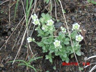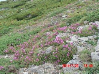 ![]() 雪渓の下は一面エゾコザクラの群生 |
