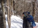 | ◇大型低気圧が来る前の晴天を狙った今回の山行。登山口には雪はなかったが、高度を上げるにつれ雪は増え、凍った急登に肝を冷やす。ピッケルを駆使して稜線に上がると、そこは白銀の別世界!動物の足跡だけが残る誰もいない静かなブナ林。空の蒼と雪の白、言葉を失う美しさだった。(K.Tam.) |