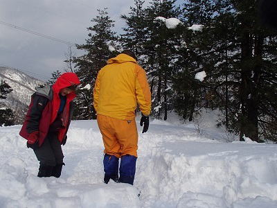 ![]() テント設営の最初は圧雪作業から。 なかなか平坦にならない |