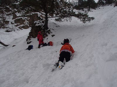 ![]() 下りはグリセードで。 「ちがう!こうするんです・・・」と指導中 |