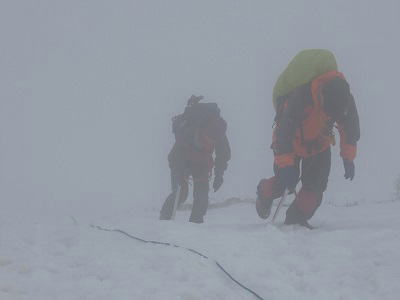 ![]() 濃霧の中を稜線まで登り切りました 急登箇所には、パステルツアー客用にロープが |
