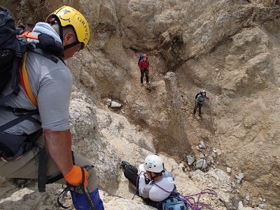 ![]() アイゼンを利かせた急下降の練習 |