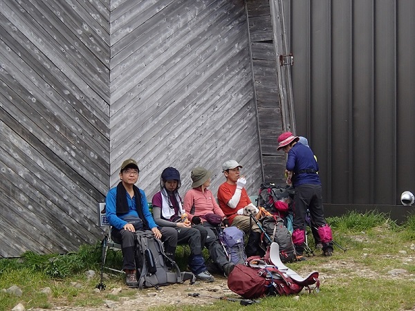 現皇太子殿下が泊まられた弥山小屋の旧棟の前でたっぷり休憩。