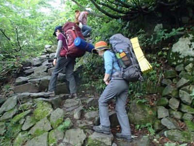 | 《コースタイム》 【7月19日・曇り後雨】 別当出合(6:15)〜中飯場(7:05)〜別当覗(8:05)〜甚之助避難小屋(9:00)〜南竜分岐(9:35)〜南竜山荘(10:10)〜≪道間違い≫〜南竜ヶ馬場(11:00) 【7月20日・晴れ】 南竜ヶ馬場(5:30)〜展望台(6:20)〜室堂(7:00)〜白山奥宮(7:45)〜室堂(8:20/45)〜南竜ヶ馬場(10:00/10:50)〜分岐(11:25)〜甚之助避難小屋(11:45)〜中飯場(12:50)〜別当出合(13:30) |