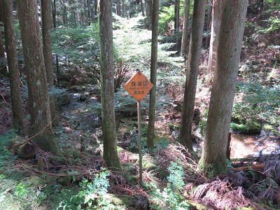 ![]() 途中、沢の分岐に立つ「休猟区」標識 |