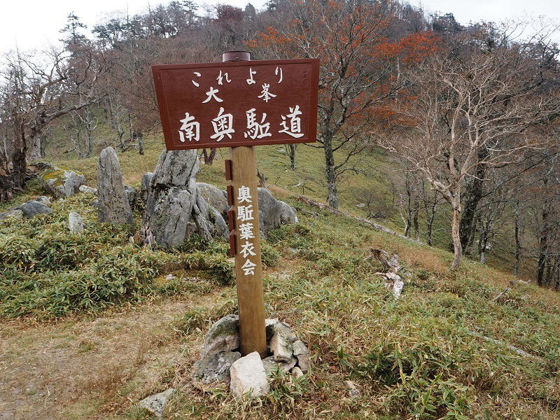 | 前鬼林道ゲートをより奥駈道を目指す。 静寂な山中に立つ小仲坊の傍から登り始める。急登が続き重いザックが足の運びを鈍らせる 奇岩の二ツ岩、遠くに見える五百羅漢の岩峰群が大峰の厳しい山を感じさせる。 釈迦ケ岳〜孔雀岳〜仏生岳へと進む。紅葉を楽しむには少し遅かったが岩稜帯、笹原、倒木の平原と道を踏み楊子ケ宿に到着。男性陣が重いテント装備を担ぎ上げてくださったが寒さ、疲れもあり全員小屋での宿泊とし、明日の英気を養うことにした。(N.Has) |