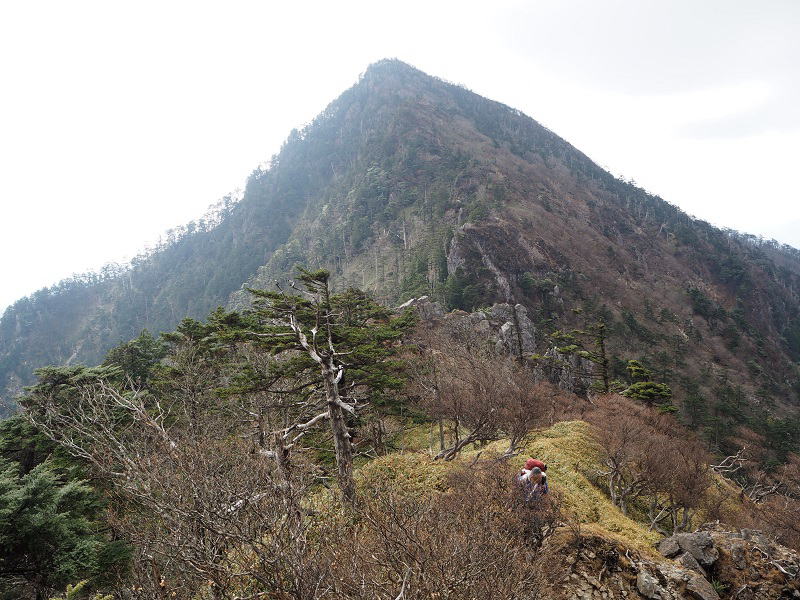 孔雀岳との鞍部から釈迦ヶ岳をふり返ります。 南からの斜面とは斜度が全然違いますね。 |