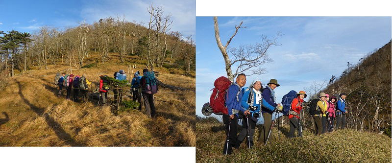 朝日を浴びながら、大峰最深部のプロムナードを進みます。すでに冬枯れの季節になっていますが、昨日ほど冷たい風は吹かず、まことに快適! |