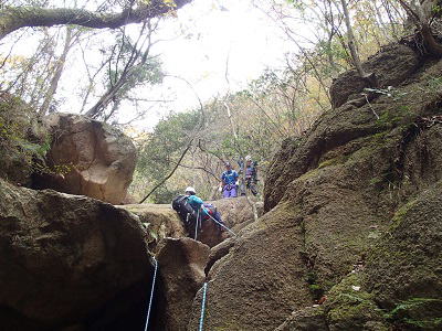 | ◇4月の蓬莱峡に続き、2回目、六甲地獄谷でのアイゼンピッケルトレーニング。今回は特に下りでの技術講習がメイン。さらに確保技術の訓練が加わり、様々なビレイの取り方を実践、併せてこれまで学んだザイルワークの復習を行う。最後は懸垂下降の実習もあり、たっぷりと一日充実した時間を過ごした。 | |