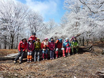 | 渡渉を繰り返し、傾斜の急な沢沿いの道を登る。2時間近い登りの後着いた明神平は、ガスに包まれた霧氷で幻想的な雰囲気だった。 そこから桧塚までは、時折青空も覗き、次々に現れる冬枯れの木々に咲いた氷の花に、感動の連続だった。 |