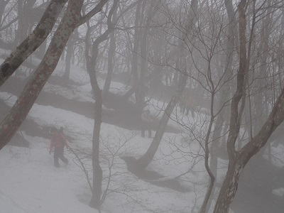 ![]() 汁谷到着・・・真冬ならリフトが動いて賑やかな地も 雪ばかり、霧もますます濃くなって・・・ こんな中、下まで降りられるだろうか? |