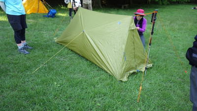 ![]() 昼食後、芝生広場でツエルト設営 ストックを使って張る方法 |