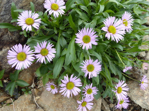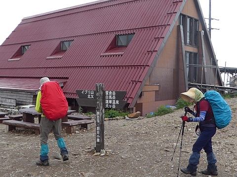 | 昨夜来の雨の中出発。山頂から三国境へとコマクサの群落を横目に黙々とすすむ。三国境から下方の黒部側に雪原が広がっているのがみえた。鉢が岳の巻き道に入ると、雪渓のトラバースが5か所ほどあって、アイゼンを使う。最後に大きな雪渓を上り詰めたら、ほどなくして雪倉避難小屋。小屋から雪倉岳山頂までは、様々な花で彩られて登りがあまり苦にならなかった。水場を過ぎると雪がとけたばかりで水芭蕉やハクサンコザクラ、キヌガサソウなどが咲く小桜が原、湿地帯の連続。残雪が多くて水平道は通行止め、朝日岳経由で朝日小屋へ向かうが、疲れ果ててお花を楽しむゆとりがまったくなくなっていた。 |