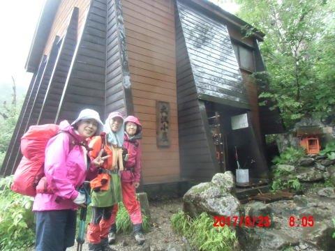 ![]() 早々と雨が降っている中、大沢小屋到着 |