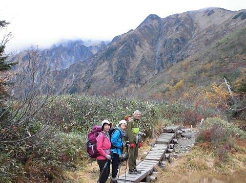 | 10月8日(日)晴れ わさび平小屋(5:50)〜登山口(6:00/10)〜杓子平(11:10/30)〜笠新道分岐(13:10)〜笠ヶ岳山荘(14:55/15:15)〜笠ヶ岳山頂(15:40/16:20)〜笠ヶ岳山荘(16:30) 昨晩の雨も上がって晴れ、気分よく登る、登るにつれて、槍ケ岳・穂高連峰・西穂高岳までが展望できる。只、登りはかなりきつい、杓子平からは笠ヶ岳が正面に!! 10月9日(月)晴れのち曇り 笠ヶ岳山荘(6:15)〜笠新道分岐(7:35)〜秩父平(8:40/45)〜弓折岳(10:45)〜双六小屋(12:15/13:00)〜弓折乗越(14:15)〜鏡平山荘(15:05) 山荘の前で穂高連峰の大キレットから登るご来光を眺めてからスタート。右手に槍穂高、振り返れば笠ヶ岳、雄大な風景の中を歩くのは縦走の醍醐味。草紅葉の中にたたずむ双六山荘まで歩いたが、時間の関係で双六岳はパスして、赤い屋根に青い池が点在している鏡平山荘に下った。 鏡平山荘(6:15)〜わさび平小屋(9:15/25)〜新穂高温泉(10:35) 昨日の午後から雲が山頂を覆い隠していて鏡池に映る槍ヶ岳は見れなかったが、下っていくにつれて、紅葉は鮮やかさを増し素晴らしい錦秋の世界になる。その美しさに見とれながら連休も終わり静かな新穂高温泉に着いた。 |