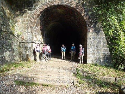 | 【コースタイム】西宮名塩駅(9:35)〜峡谷道入口(10:05)〜親水広場手前・昼食(11:35/12:10)〜親水広場(12:19)〜どんぐり道〜東屋(12:59)〜大峰山(14:20)〜さくら道〜東屋(15:10)〜親水広場・桜の園入口(15:40)〜武田尾駅(16:15) 青空と川の流れを眺めながらの廃線跡の道は、木陰でトンネルの中は本当に涼しく暑さも凌げて快適でした。枕木を踏みながらトンネルの出口から見える丸く切り抜かれた緑の風景の美しさは感動的でした。最後の552.3mの大峰山の登りはきつく感じましたがほどよい疲れでした。 |