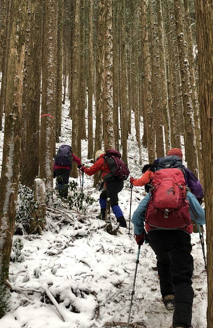 前日より雪が降り、霧氷を期待して胸をはずませる。不動滝登山口より積雪少々ありアイゼン装着する。なだらかな雪化粧の樹林帯を行く。避難小屋にて昼食をとる。外はかなり冷えた。三畝峠より霧氷の林を通り抜け時折日もさした。風の強いところを通り抜け山頂に登頂する。曾爾の山々も一望できた。下りはなだらかな歩きやすい道で、一気に休憩小屋まで下る。アイゼンをはずし旅行村まで行く。霧氷の樹林帯を歩くことができ、大満足の一日でした。
