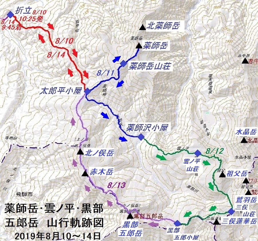 | 折立~太郎兵衛平~薬師岳2,926m~太郎兵衛平~雲ノ平~ 黒部五郎岳2,839.6m~北ノ俣岳2,662m~太郎兵衛平~折立 |