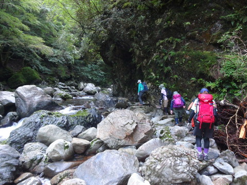 | 【コースタイム】宮ノ谷駐車場(7:45)~風折谷出合(8:45)~高滝(9:05)~奥ノ出合(11:30/12:00昼食)~池木屋山(13:45)~霜降山(14:35)~P1222(15:25)~P866(16:45)~鹿除けネット(17:05)~下山(18:20) | |
