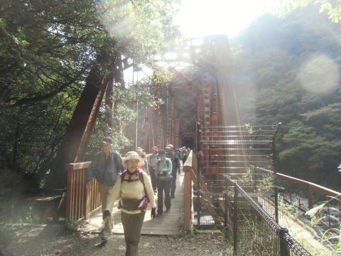 | 【コースタイム】西宮名塩駅(9:50/10:10)〜生瀬道合流地点(10:30)〜第一トンネル(10:45)〜鉄橋(11:30)〜親水公園 (11:55/12:25昼食)〜あかまつ休憩所(13:10)〜つつじが丘展望所(13:35)〜東屋(14:10)〜親水公園(14:30)〜武田尾駅解散(14:50) 西宮名塩駅で他会の方と集合、今回は西大和がホストで、リーダーから説明を受け歩き出す。武庫川渓谷沿いに4.7kmの廃線跡。4つのトンネルと鉄橋を過ぎると親水公園に到着。昼食後遠見の道コースに入り、ササラ沢から滝コースを経て親水公園に戻り、武田尾駅にて解散。親水公園の紅葉にはまだ早かったが、ササラ沢からの下りは面白いコースであった。 |