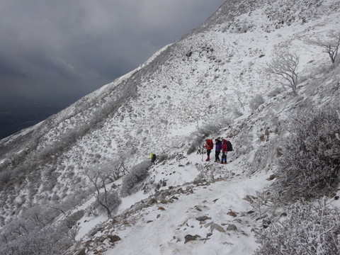 | 駐車場はとても空いていて神社のすぐそばに車を停めることができました。前日の雨のため、ぬかるんでいて滑りやすく慎重に登る。裾野が広い伊吹山、滑る足元に注意しながら約1時間半をかけて三合目に到着。そのあたりから時々突風が吹き、足を踏ん張り風が収まるのを待ちながら高度を上げていく。今年はどこも雪が少ないので、登るほどにどんどん積雪量が増えていくことが嬉しく、八合目辺りは20p以上はあり、アイゼン歩行が快く、見事な樹氷に覆われた木々が広がる頂上到着!! 積雪量は分かりませんが、たくさんの雪と、この日は西高東低の冬型の気圧配置のため、冬山独特の北風の中での登頂となりました。 | |