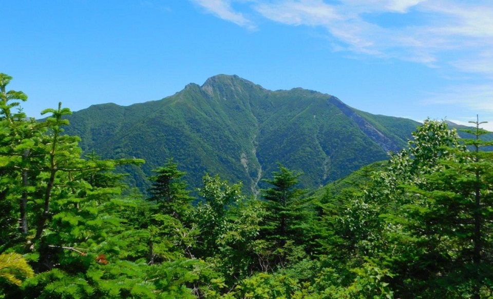 | 登山口よりひたすら上りが続く。時折、細い丸太の桟道があり慎重に行く。兜型の塩見岳の稜線が見えた時は感動した。段々近くなる山容に見とれ、長い縦走の始まり、恐れと頑張ろうという気持ちが半々だった。 | |