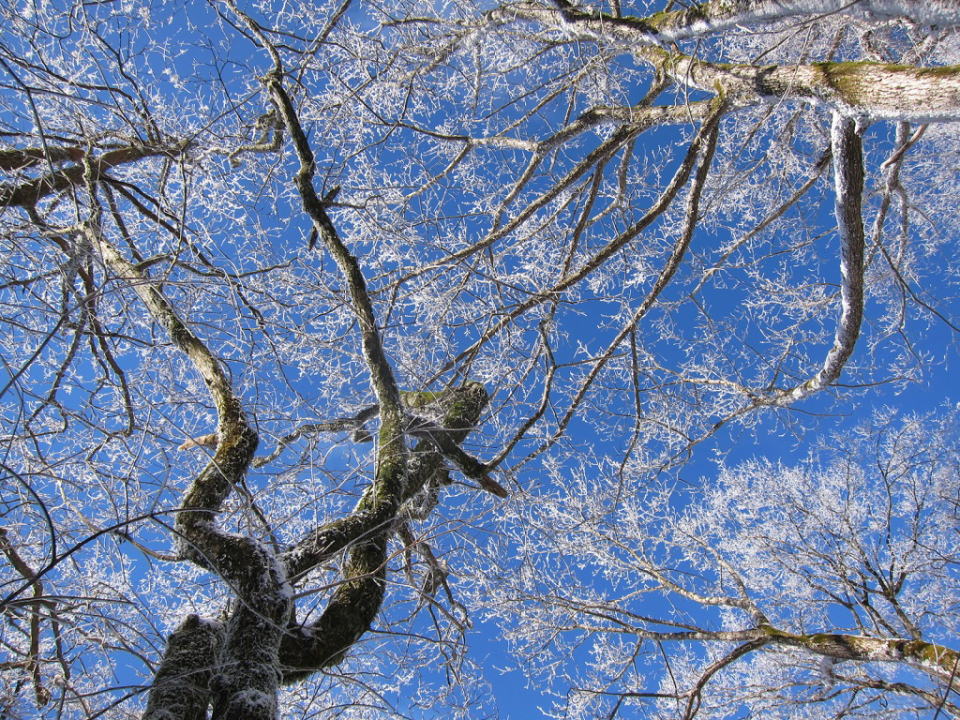 | 綿向神社の奥社の参道になっている歩きやすいジグザグの道を登っていくと、三合目あたりから雪が・・・。 山頂3センチの積雪と青空に美しい霧氷の花が映える。鈴鹿の山々の展望も申し分なし!! 素晴らしい季節に登られてラッキーでした。 |