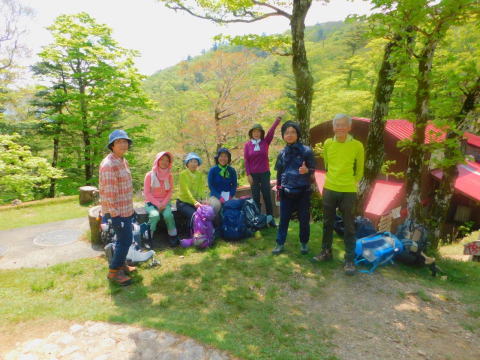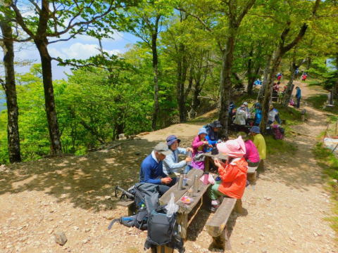 | 杉林の緩やかな道を登るにつれて、木漏れ日が射してきた。法力峠を過ぎたあたりからブナや楓などの広葉樹が多くなり、新緑の中を気持ちよく歩く。稲村小屋近くになると、傾斜もやや急になり積雪の時に何度か滑った個所を思い出した。そこには新しい鎖が付いていた。小屋から頂上へ向かう途中、道の横にオオミネコザクラを発見! 皆初めて見るので大喜び。一方、シャクナゲはあちこちに咲いているものの、少し物足りなかった。頂上から360度の景観も楽しめて、十分満足した山行であった。 | |
