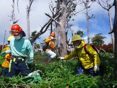 ![]() グループに分かれてのネット巻き作業 (環境省と林野庁・上北山村との連携で行われた) |
