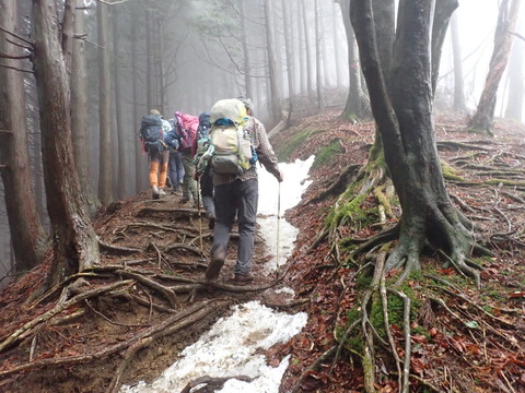 | 【コースタイム】青少年旅行村駐車場(8:10)〜不動滝登山口(8:35)〜不動堂行場(8:44)〜避難小屋(9:48)〜三峰山頂上(10:20)〜八丁平(10:40/11:06昼食)〜休憩小屋(12:08)〜登尾登山口(12:50)〜駐車場(12:58) | |