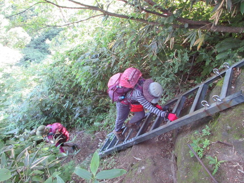 | 広い大日平の木道を端まで歩くとまた、梯子のある厳しい下りになる。そろそろ飽きてきたころ、いきなり称名の滝に続く舗装道に出た。落差350mの日本一の滝は迫力満点!! マイナスイオンをいっぱい浴びて、縦走の締めくくりとなった。 |