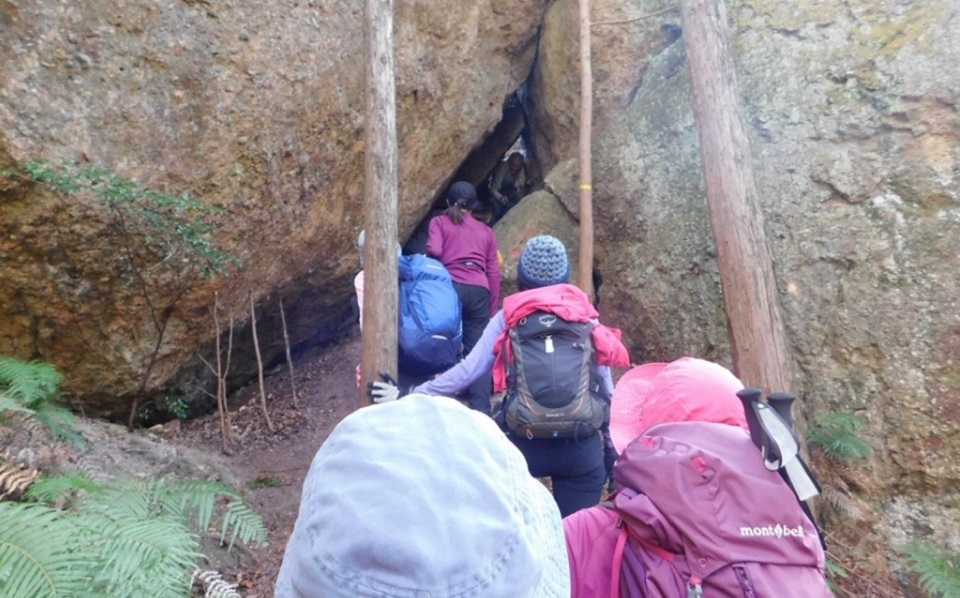 | 登山口より沢山の石仏を巡りながら、石や木の階段を登り観音山へ。頂上からの眺望は望めなかったが、途中では落葉した木々の間からまだ紅葉の残る周囲の山々を望むことができた。次は、奇岩怪石の多い筆捨山へ。アップダウンを繰り返し、広くて歩きやすい東海自然歩道を進む。山頂近くは急登で樹林に囲まれていた。山頂から分岐に戻り、沢山の巨岩が林立する羽黒山へと向かう。特に大岩の間は、ザックを下ろし慎重に進む。山頂は眺望が素晴らしく、鈴鹿の山々を望むことができた。その後、いったん車道まで下り、中腹から関富士山頂を目指す。急登の先の山頂では展望はなかった。低山だが要注意箇所が数ヶ所あった。4山とも300mに満たない山々だが、起伏と変化に富み、厳しかったが大変歩きごたえのある楽しいコースだった。 | |